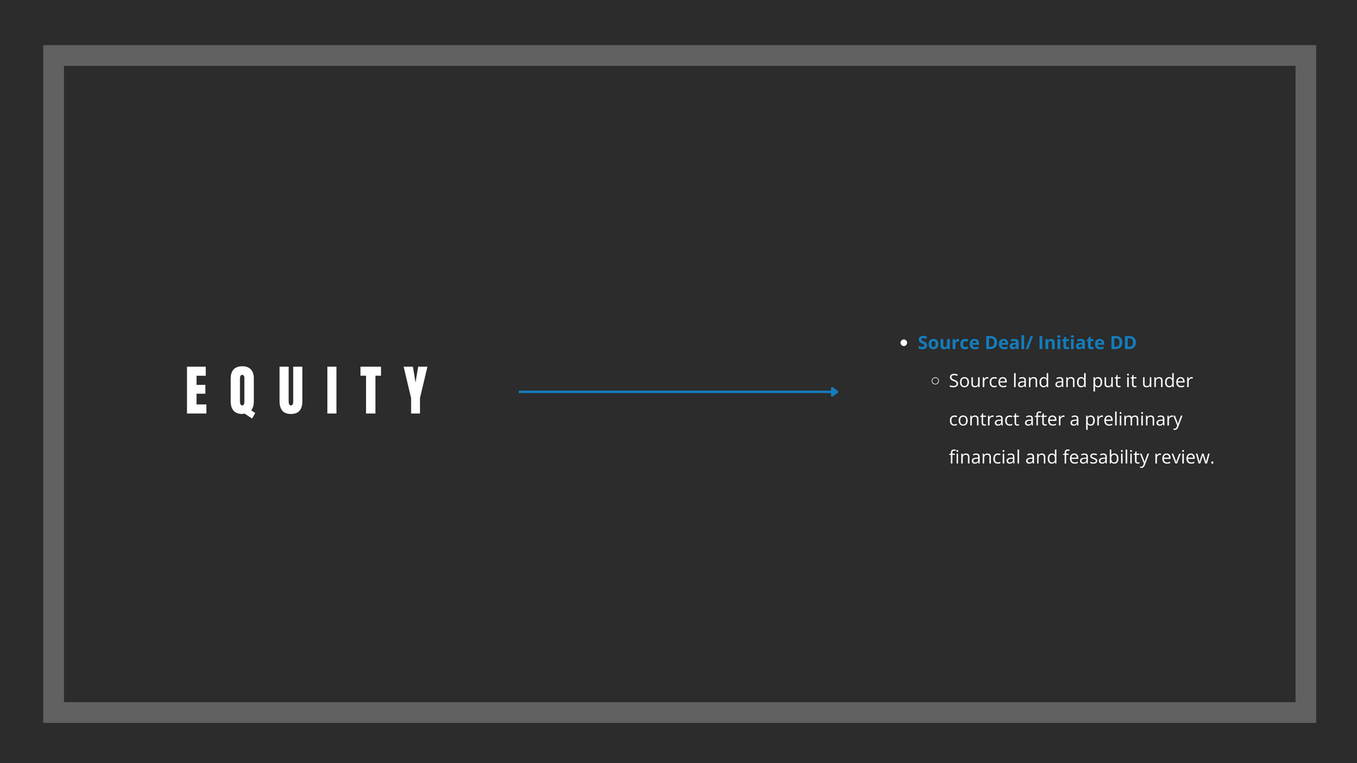 Development suitability depends on various qualitative factors such as environmental suitability, entitlement risk, topography, area demographics, and nearby supply. These factors serve as the inputs in our quantitative analysis. We quantify the full cost to develop with our strategic partners. We study and review the strength of absorption/demand for the end product, forecasted growth for micro location, and we determine if our projected profit margins warrant a full or partial development.