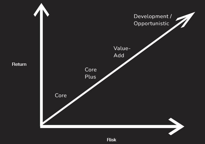 In general, the commercial real estate industry agrees on four buckets of risk & return. Investors demand higher returns for higher risk deals. Conversely, investors accept lower returns for lower implied risk in deals. While there is a consensus for deal classification, there are blurred lines and overlap in strategies.